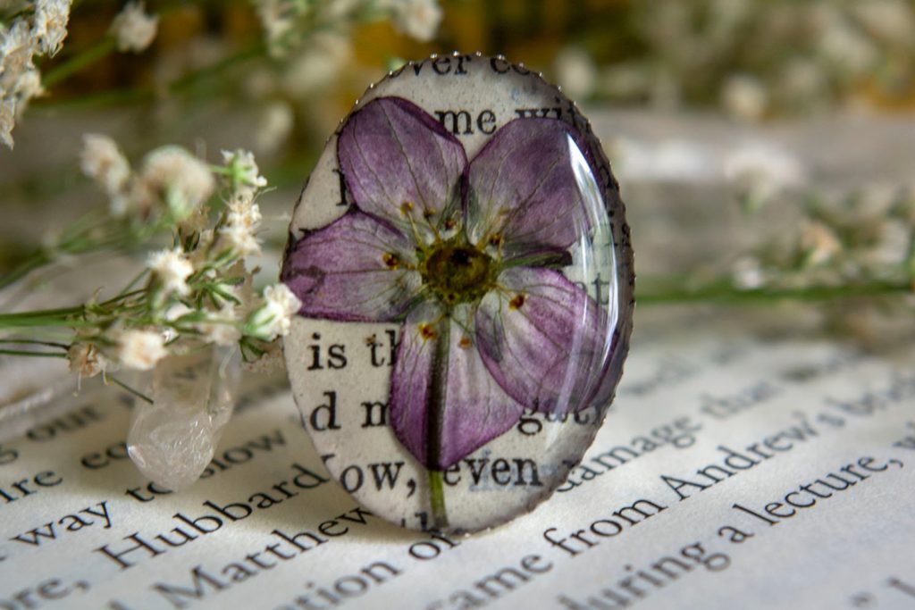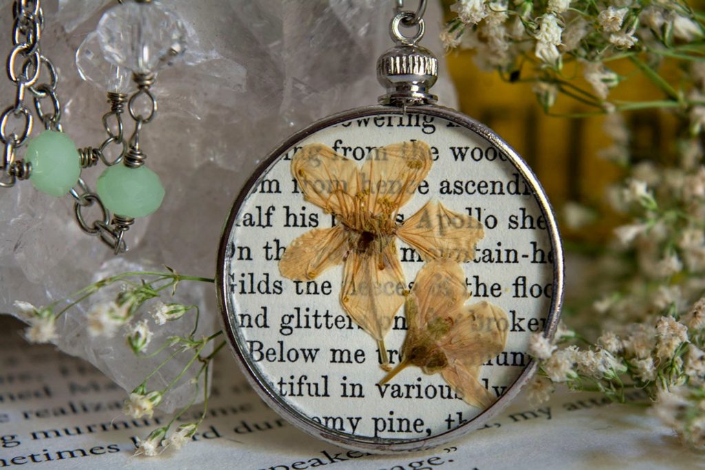 This pressed flower necklace consists of an upcycled ebook web page. Attractive and the proper solution to honor nature and literature. $24.