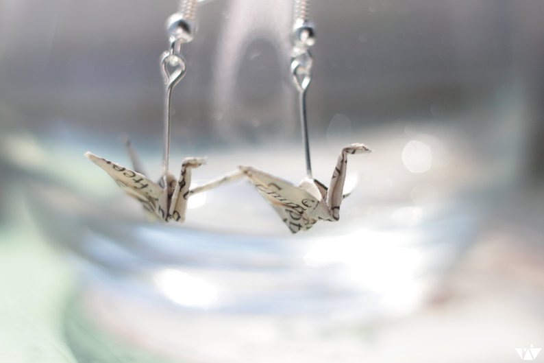Delicate and distinctive origami crane earrings. $14 and up.