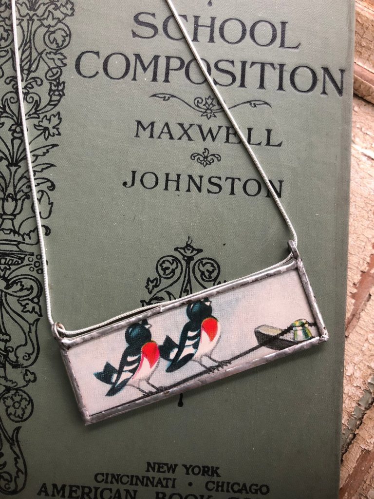 This attractive chook necklace is constituted of a classic ebook. $19 and up.