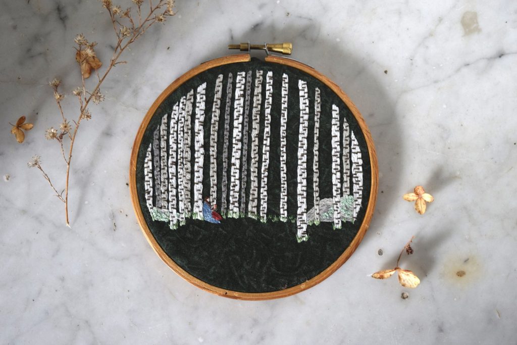 Hold up this embroidery of a reader within the woods in your favourite studying house. $50.