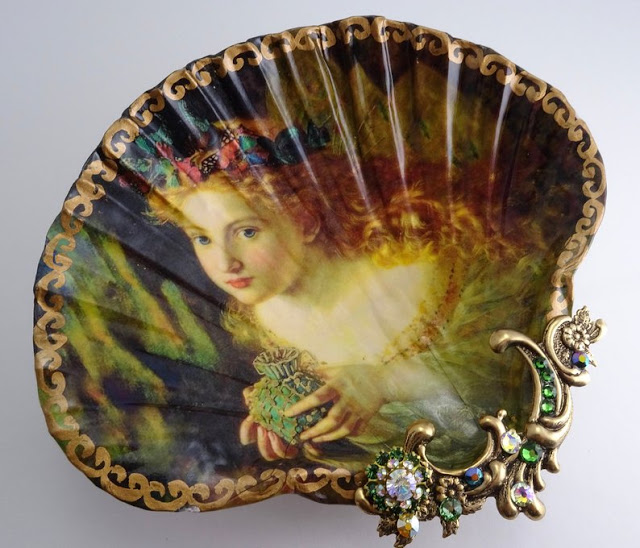 She chooses classic artwork photographs to decoupage the shells. She then handpaints Artwork Noveau impressed ornamental components and provides jewellery findings, beads and Swarovski crystals to finish these fantastically crafted items.