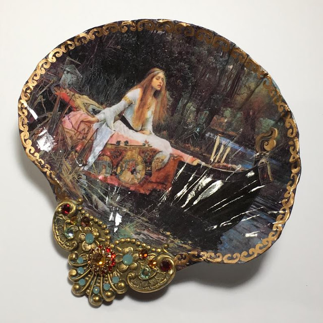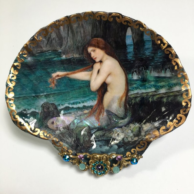 She chooses classic artwork photographs to decoupage the shells. She then handpaints Artwork Noveau impressed ornamental components and provides jewellery findings, beads and Swarovski crystals to finish these fantastically crafted items.