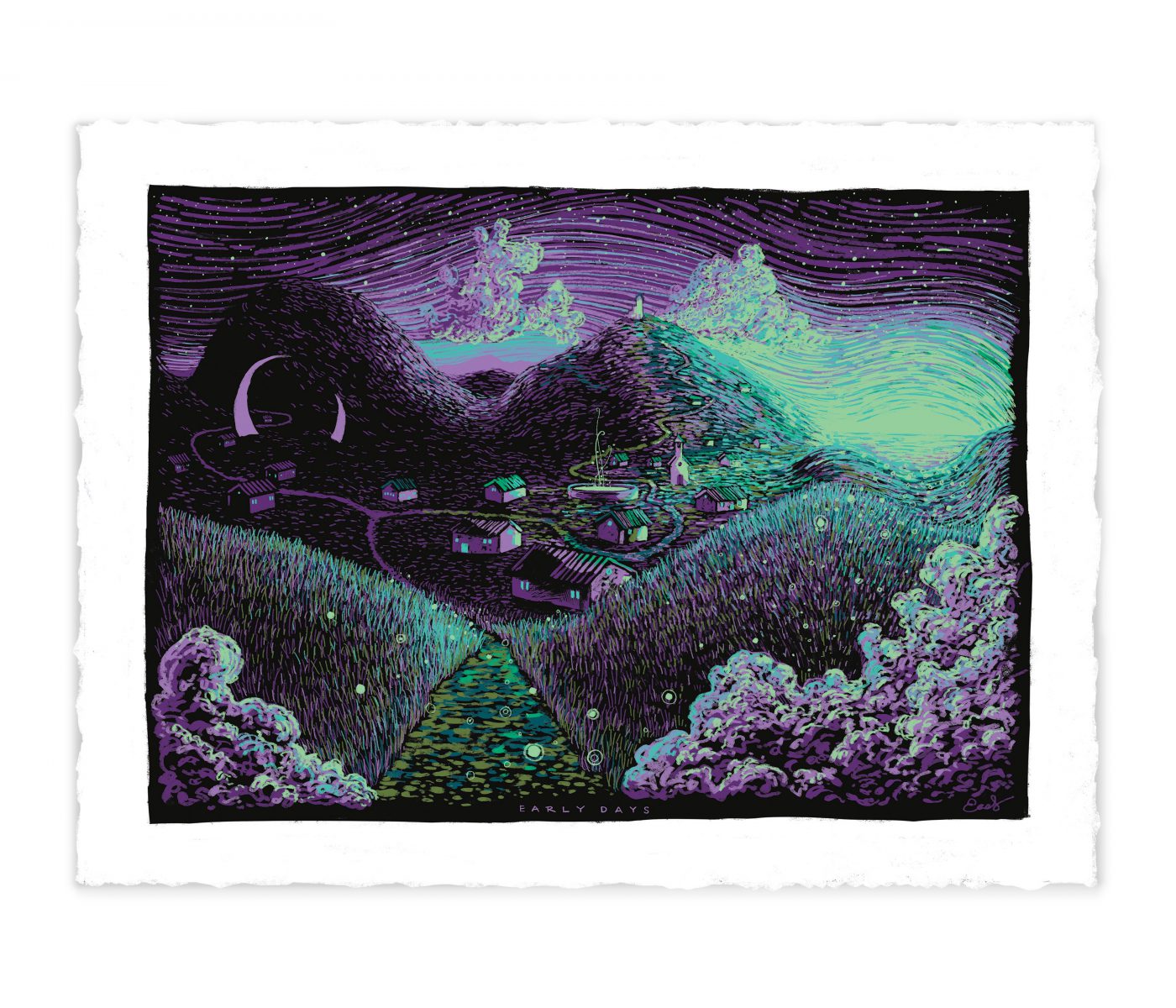 “Early Days” by James R Eads. 18″ x 24″ Screenprint. Ed of 40 S/N. $150 (Lavender Moon Version)