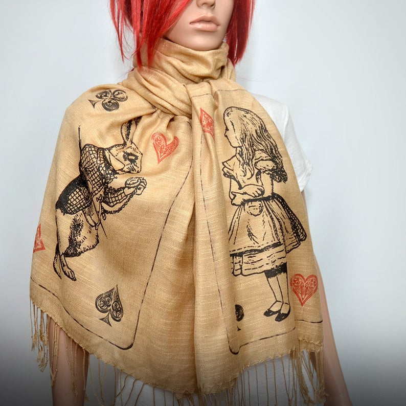 I like the linen look of this outsized Alice in Wonderland scarf.