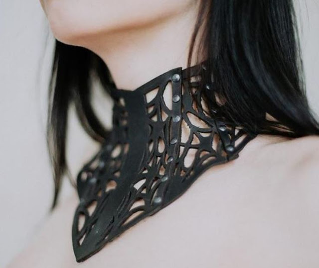 This laser lower spider net leather-based neck corset is the creation of Nika Schönewolf of beetandowl.