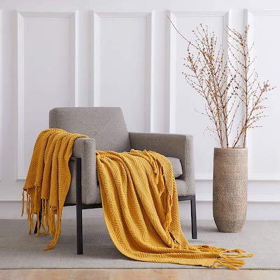 A heat mustard yellow blanket provides a pop of shade whereas retaining you heat as you flip these pages.