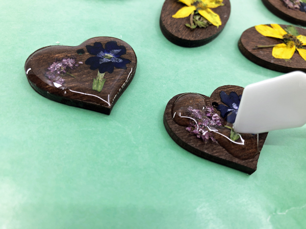 Some individuals use spray adhesive however I want a extra managed strategy when gluing delicate dried flowers onto the cured resin background. I simply use just a little Mod Podge to safe the blooms and leaves.