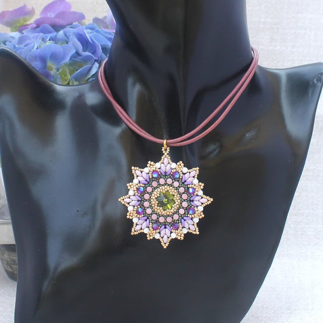 She has many mandala impressed pendants and earrings. She makes full use of seed beads, Czech beads and delightful Swarovski crystals to create the intricate patterns you usually see in richly patterned mandalas.