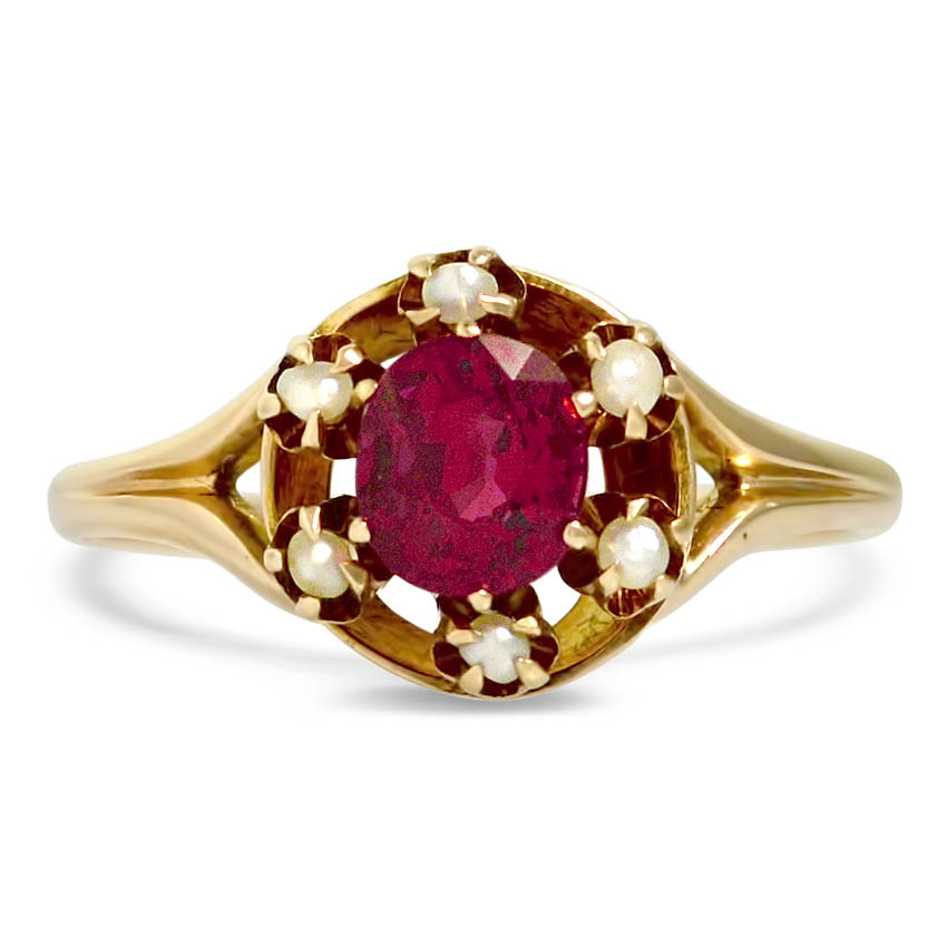 This Victorian ring boasts intricate particulars from its distinctive concave halo to its cut up shank band crafted in 10Ok rose gold. Delicate seed pearls body the roughly 1 ct. pure ruby set within the middle.