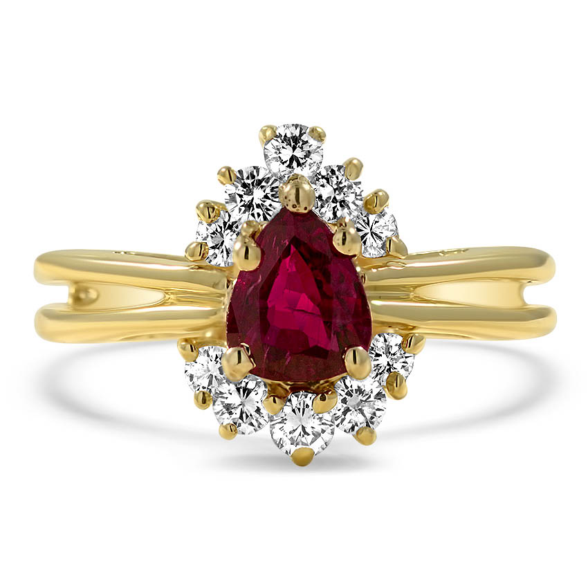 This regal ring is loaded with showstopping particulars. A richly coloured pear formed ruby on the middle is surrounded by good reduce diamonds and ribbons of 14Ok yellow gold.