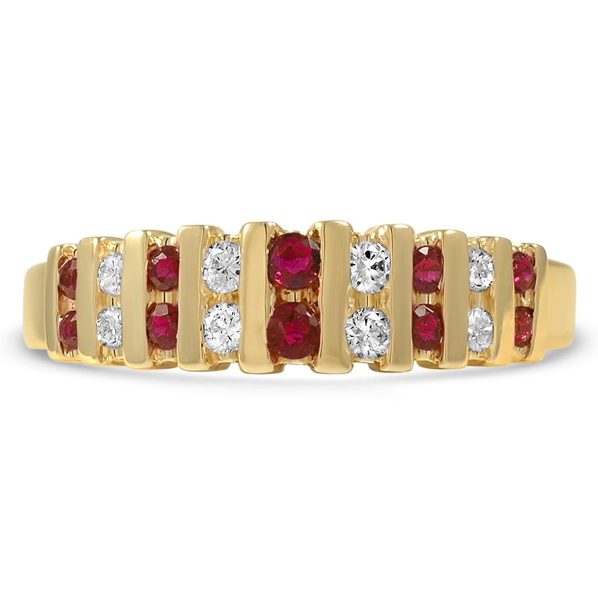 This beautiful Retro-era engagement ring from the 1940’s flaunts repeating vertical rows of good reduce diamonds and rubies set between 18Ok yellow gold bars.