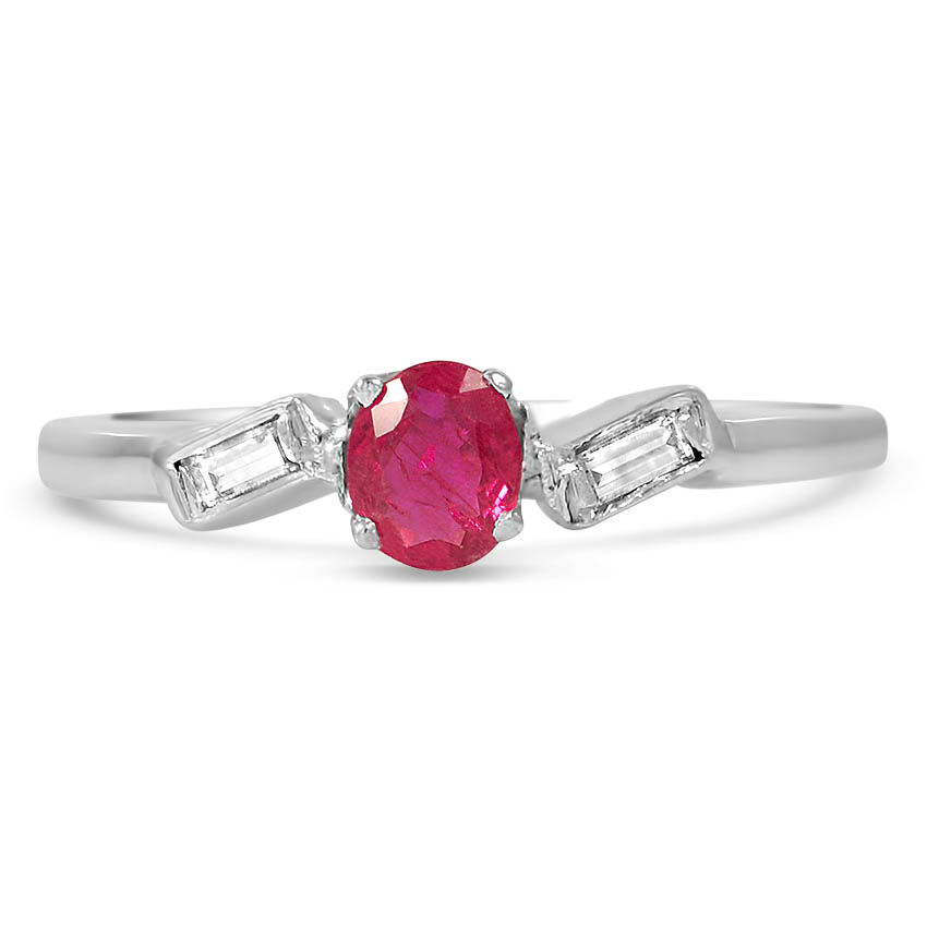 This Artwork Deco period ring from the 1930’s is a straightforward magnificence with a pinky oval ruby on the middle of two angled baguette diamond accents. The Artwork Deco period was stylized by geometric shapes and white gold bands.