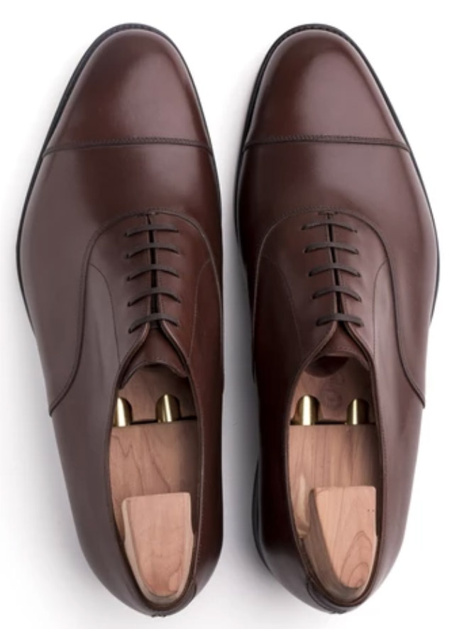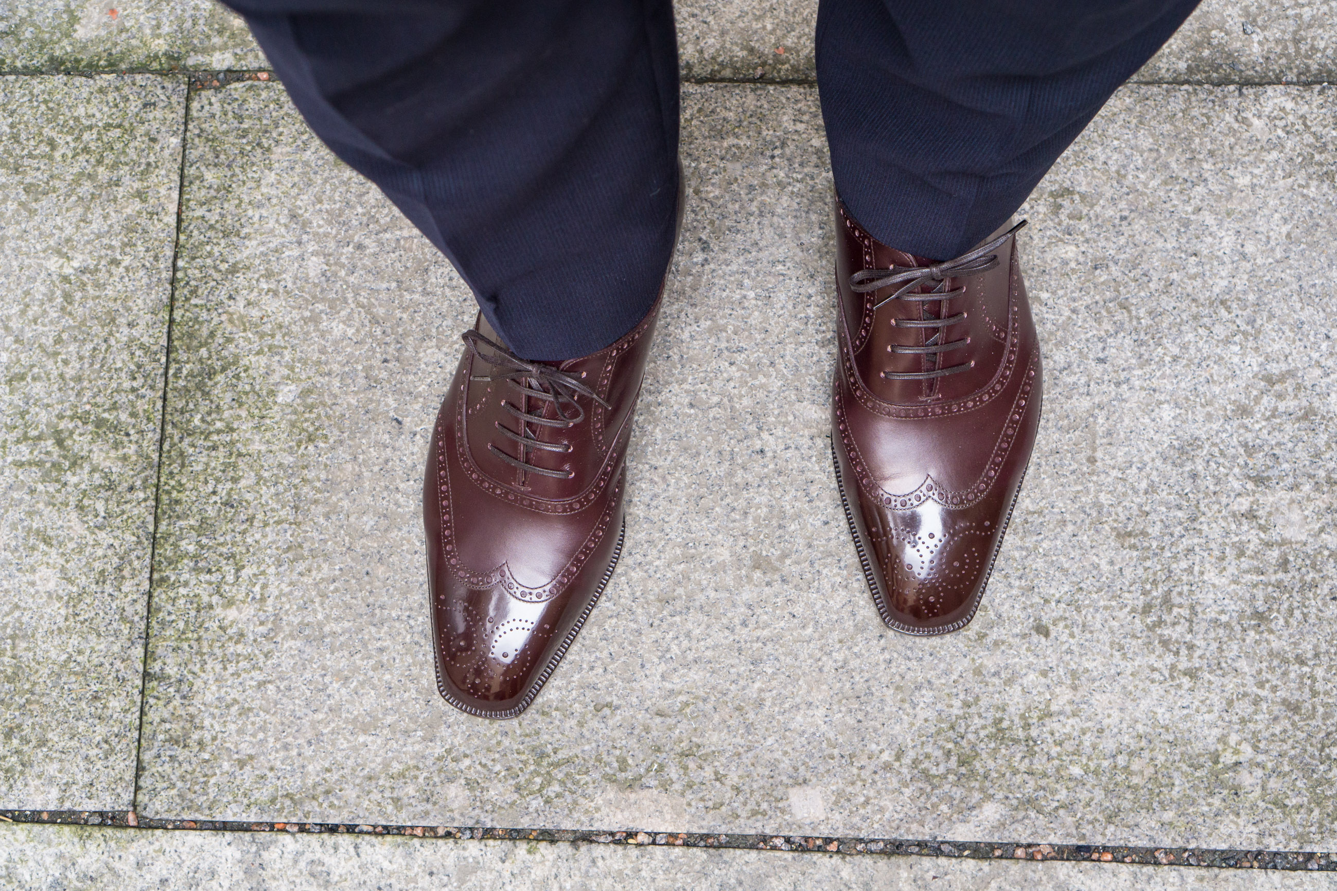 A pair of TLB Mallorca Artista oxfords within the shade Vegano Darkish Brown. Right here outdoors in cloudy climate, the place they appear fairly darkish with a touch of purple.