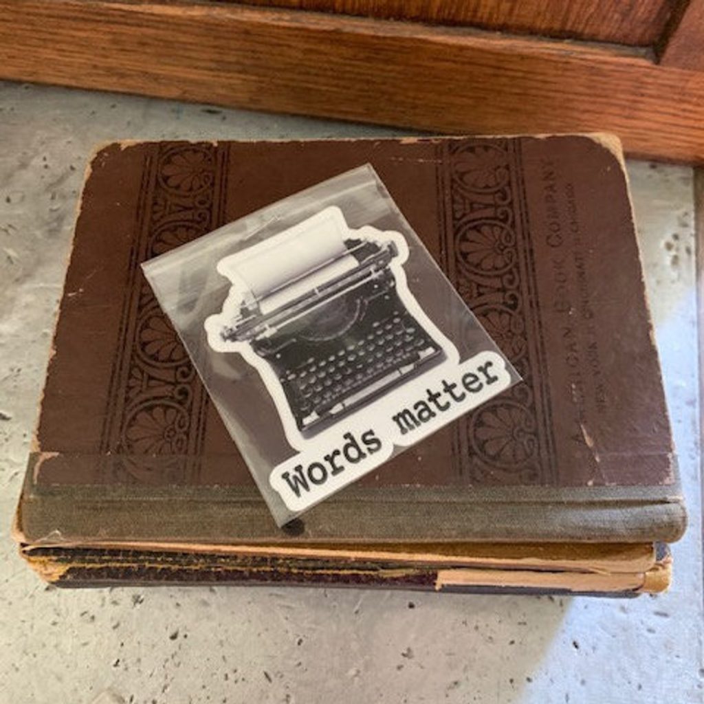 For the writers, in addition to those that love typewriters, is that this “phrases matter” typewriter sticker. $four.