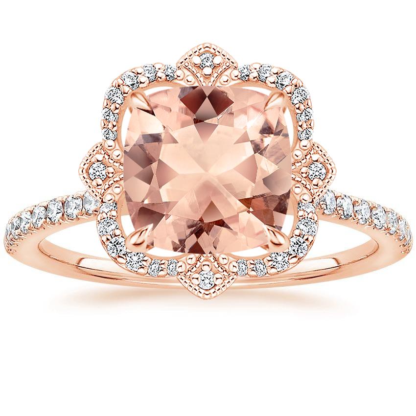 Cushion reduce morganites completely complement the sq. formed halo of this regal ring. The classic impressed ring shimmers with ornate milgrain and diamond detailing.