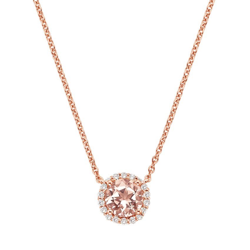 This pendant’s glowing halo and heat rose gold chain flatter its middle millennial pink morganite.