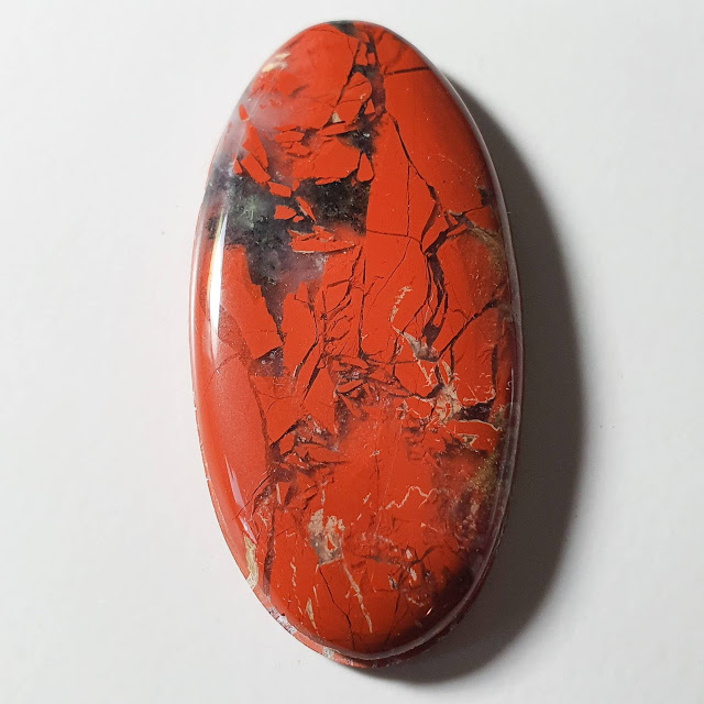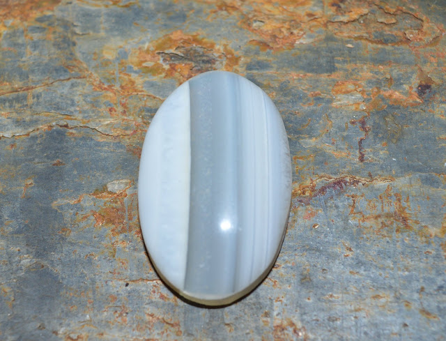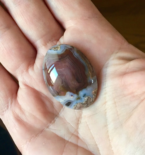 This pretty New Mexico thunder egg gemstone (the uncooked stone was made out of brown rhyolite, crimson, clear and gray agate and pale blue widespread opal) grooved cabochon is from ProspectingArizona.