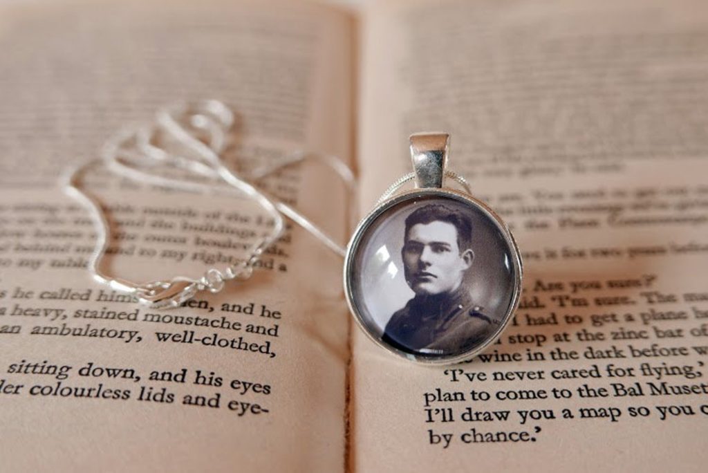 In case you’ve ever wished a pendant of Papa from his (very good-looking) youth. $10.50.