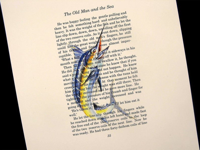 Is that this not essentially the most attractive print you’ve ever seen? A marlin painted over a web page from The Previous Man and the Sea. Gorgeous. $20.