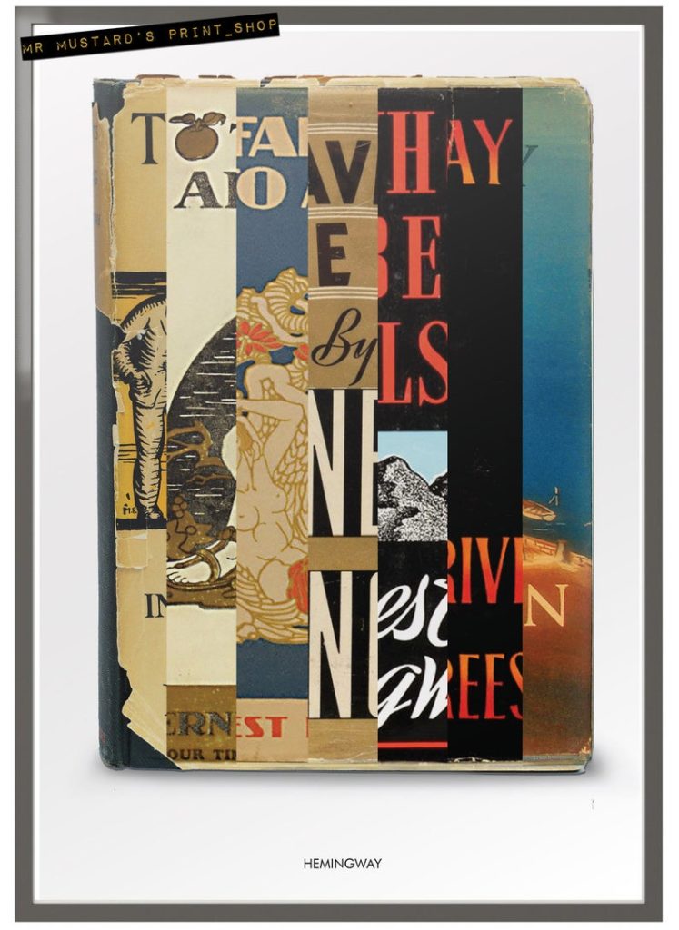 Please admire this piece that sliced up the covers for all of Hemingway’s books and made them into one. Additionally, please purchase it for me, thanks. $17 and up.
