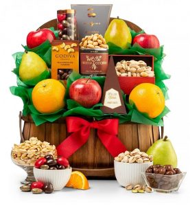 This crop of contemporary fruit, nuts, candies and extra is displayed in a country barrel basket with lid and deal with. In conclusion, it’s as enjoyable to open as it’s to take pleasure in.