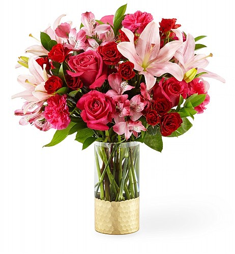 Be My Beloved delivers a Valentine that the one that you love will cherish eternally! Pink blossoms in each shade arrive on this attractive beveled gold and clear glass cylinder.
