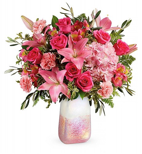 Blushing Gemstone Bouquet is impressed by the ever-amazing rose quartz, the gemstone that symbolizes love. This iridescent artwork glass vase and opulent pink rose bouquet blushes with romance.