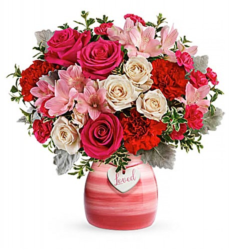 Valentine’s Day is Painted in Love with this candy pink and crimson bouquet, lovingly organized on this hand-painted ceramic vase with “liked” pendant.