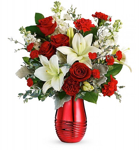 Sweep them off their ft with this luxury bouquet of crimson roses and aromatic white lilies, introduced to perfection in a radiant rouge ceramic vase.