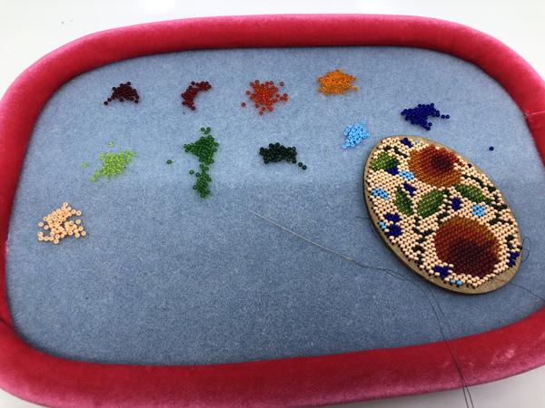 Additionally included within the equipment are the beading chart, directions, beads, thread, 2 beading needles and the felt backing.
