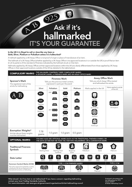 Hallmarking just isn’t a common requirement however it’s a authorized requirement within the UK for all treasured metallic jewellery no matter the place it’s made, if the items are above a sure weight threshold (1 gram for gold, 7.78 grams for silver, zero.5 grams for platinum and 1 gram for palladium). The items are examined at any one in all four Assay Workplaces earlier than being hallmarked (stamped).