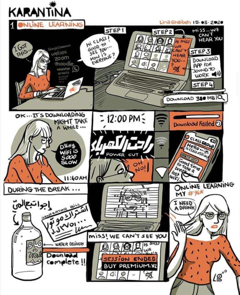 Lina Ghaibeh is a professor on the American College in Beirut and a comix artist. I came upon about her “Karantina Lina” on Twitter.