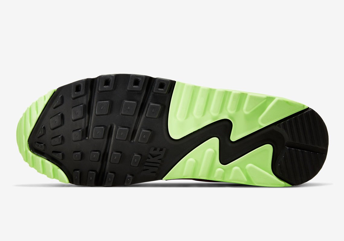 Most akin to the aforementioned ’95 silhouette, “Pink Blast” and “Ghost Inexperienced” animate the Air Max 90’s TPU eyestays. Whereas notable, these particulars fall brief within the statement-making when in comparison with signature mudguards, that are clad within the vibrant rose hue and met on the heel by “NIKE AIR” emblem of equal aptitude. Elsewhere, the complementary Volt-like tone animates facet “AIR MAX” home windows, Air unit enclosures, forefoot tread and branding on tongues and insoles. “White” and “Black” fill within the gaps with the latter most notable on the profile Swooshes.