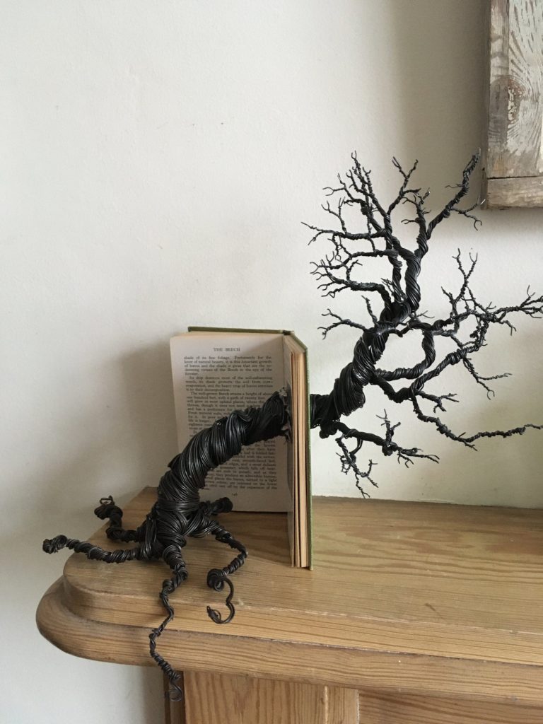 This wire twisted tree is rising by way of a guide titled Observers E book of Timber. $62.