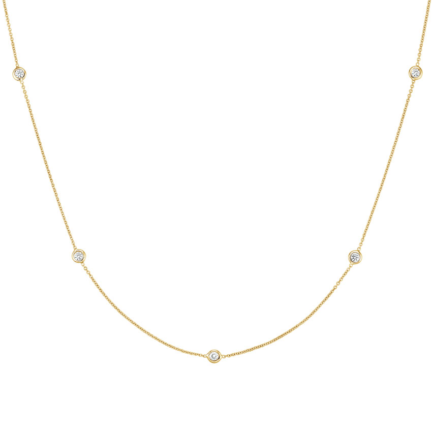 Bezel-set diamonds are evenly spaced alongside a fragile chain on this traditional and chic necklace.