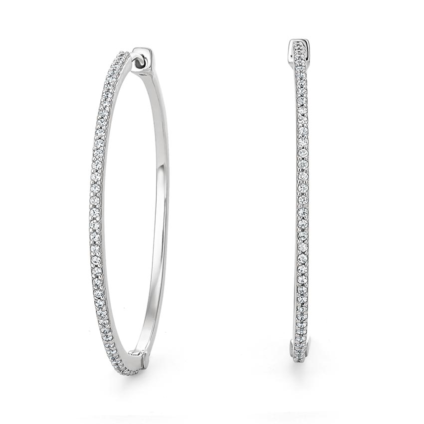 These glamorous hoop earrings function dazzling diamonds with easy latch backs to maintain these elegant earrings in place.