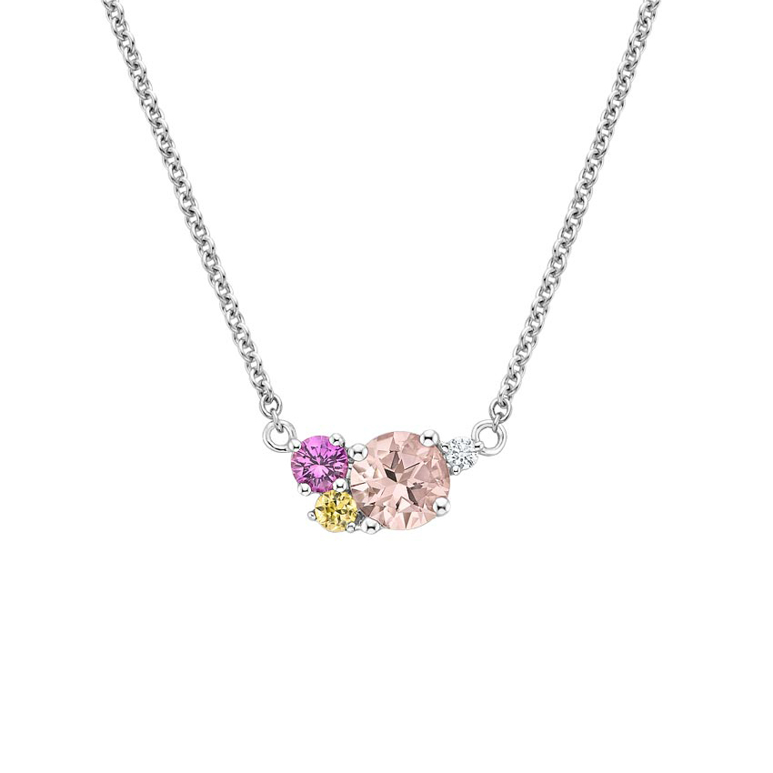 As colourful as a bunch of posies, this playful and stylish pendant incorporates a cluster of pink and yellow sapphires, a glowing morganite, and a glittering diamond.