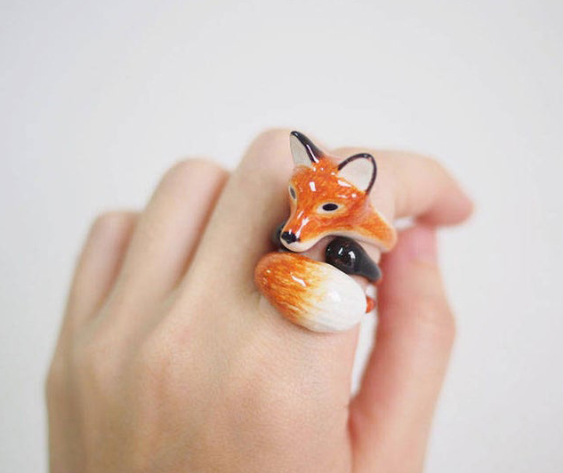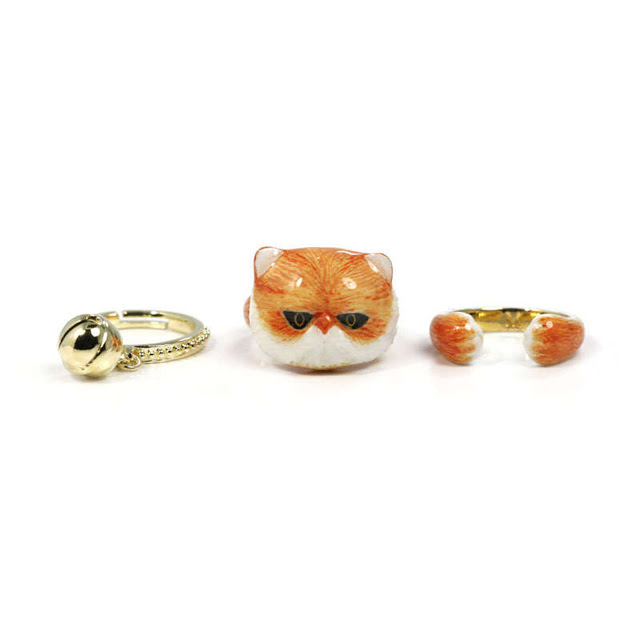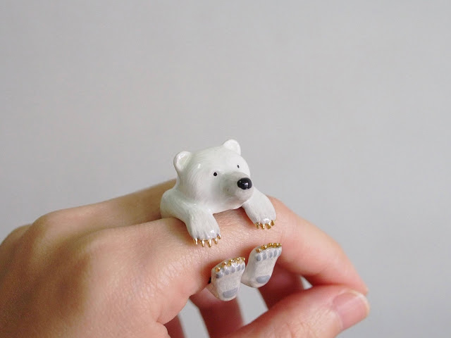 My favorites are her animal hugging rings which can be found as single or triple units. These handmade rings are primarily comprised of brass which is then gold plated. One full coat of enamel on prime produces a tough, sturdy end.