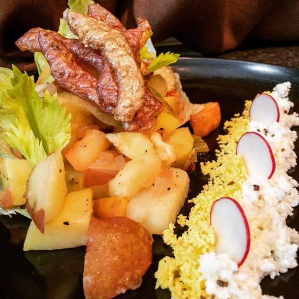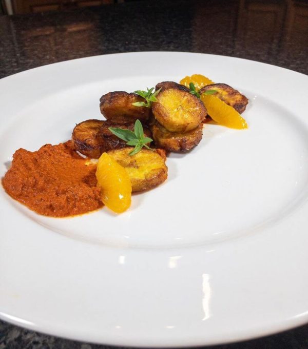 Guajillo citrus plantains with a micro basil garnish.