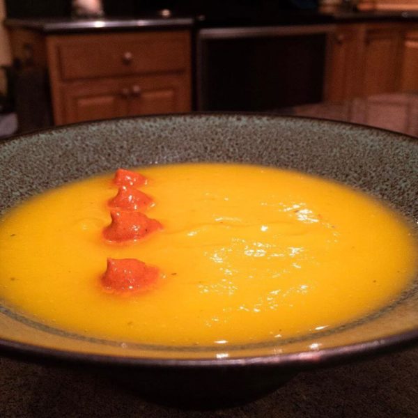 Butternut squash soup with chili puree.