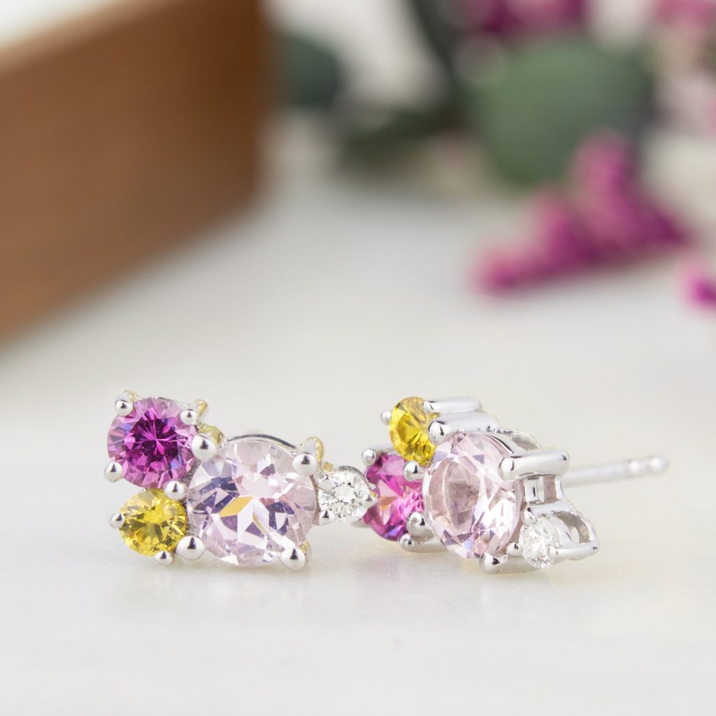 A glittering gemstone cluster of sapphires, diamonds, and morganites collect collectively for a very distinctive look. These gemstone stud earrings are stylish, playful, and completely matched to your Silver Bloom Necklace.