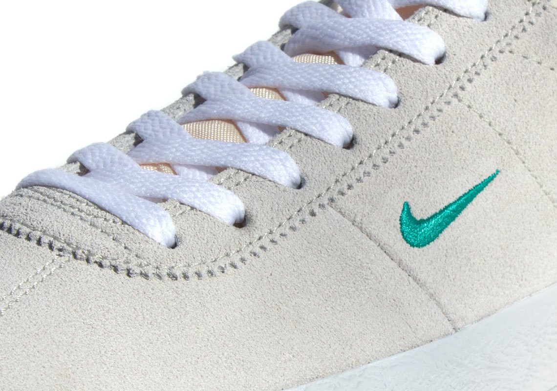 Clad in “Gentle Cream,” uppers on this Bruin characteristic an all-over suede composition. When paired with a yellowed, uncovered foam tongue and “Summit White” rubber midsole, this association turns into akin to numerous iterations of the Blazer Low, given their shared basketball roots. Mini-Swooshes on the profile, nonetheless, fall in-line with earlier Nike Tennis choices. Accompanying branding throughout the tongue, sock liner and heel be part of the herringbone sample underfoot so as to add “Neptune Inexperienced” distinction into the combination.