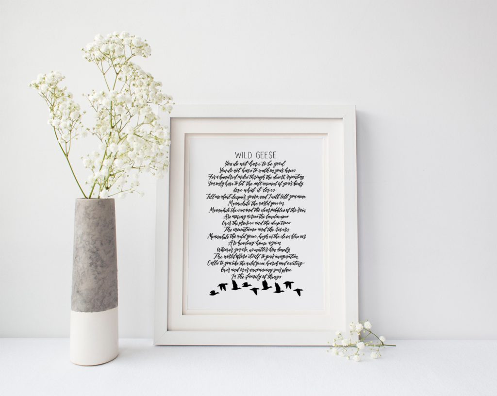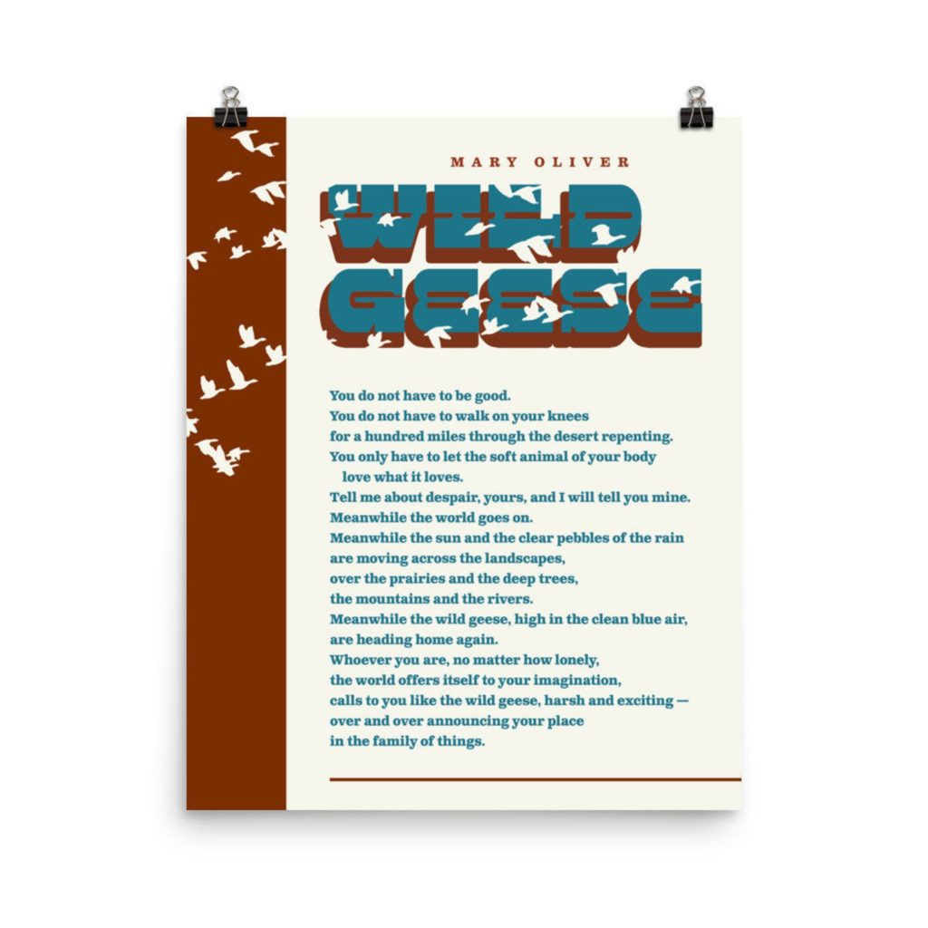 The script with the flock of geese makes this Mary Oliver print of “Wild Geese” simply so particular. $15.50 and up.