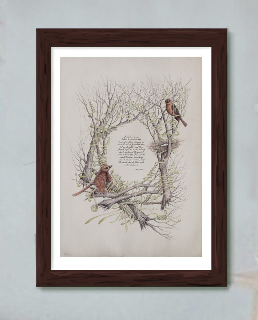 This print goes to be a splurge at $87 or extra, relying on the typography and dimensions you need. However simply have a look at the attractive pen and ink chook artwork, framing Mary Oliver’s phrases!