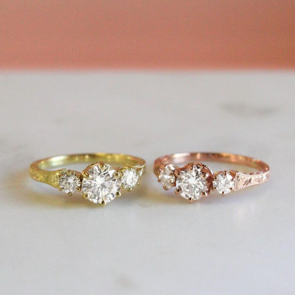 Good Earth’s Vintage Impressed Assortment options new engagement rings with classic impressed particulars, together with filigree. The Vintage Scroll Three Stone Trellis Diamond Ring options filigree embellishment and may be made to showcase an beautiful, moral diamond or sapphire of your selection. This ring is superbly complemented by the Delicate Vintage Scroll marriage ceremony ring.