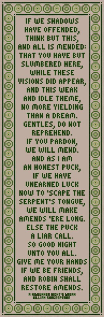 On the lookout for a challenge to maintain you busy for a bit? Why not check out this cross sew of Puck’s last speech in A Midsummer Night time’s Dream. $eight.75.