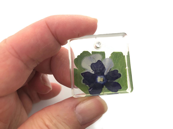 Utilizing an influence drill all the way in which does disrupt the layers of resin. Discover the shadowy space on the prime of the pansy flower on the left piece under? That’s what I imply. The pendant on the appropriate was drilled fully by hand.
