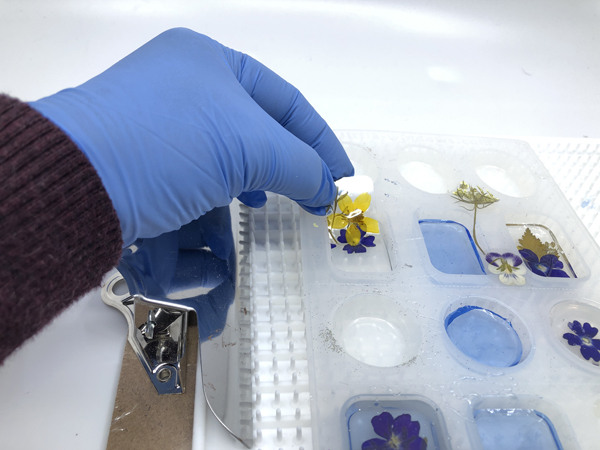 You too can put together a coloured base resin layer. Little Home windows has a white resin dye. I’ve used it earlier than with nice outcomes because the white is an efficient distinction for the flowers. This time, I experimented with a drop or two of clear blue resin colorant. I let a skinny base layer of this to remedy. The subsequent step is so as to add a little bit clear resin and safe the laminated reduce out on this second layer. Let this remedy earlier than topping up with extra resin.