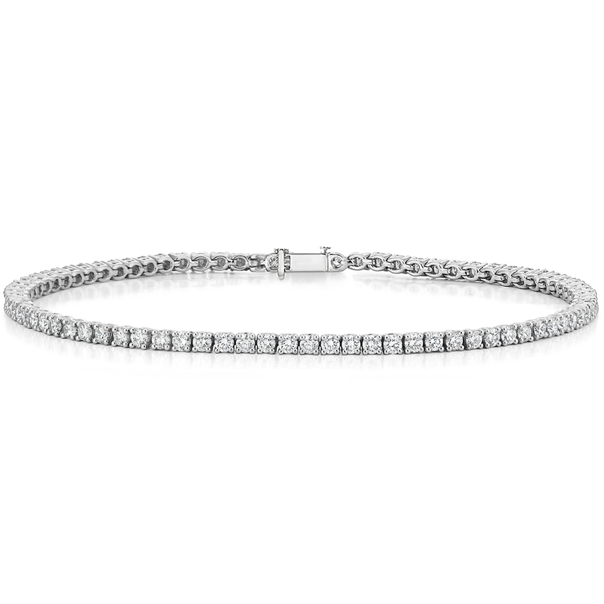 This eye-catching tennis bracelet ornaments the wrist with three carats of shimmering lab created diamonds individually set in lustrous white gold hyperlinks.