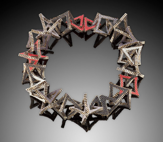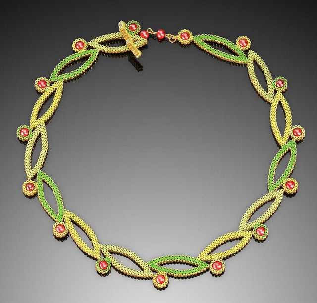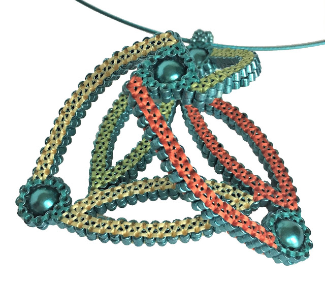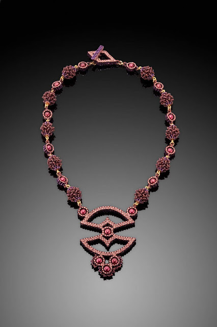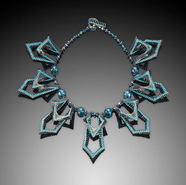 She explains :”Bead quilling is a method I developed again in 2007 that turns the beading on its aspect, exposing the holes of the beads and making the thread an integral a part of the design.” The designs are trendy and geometric.